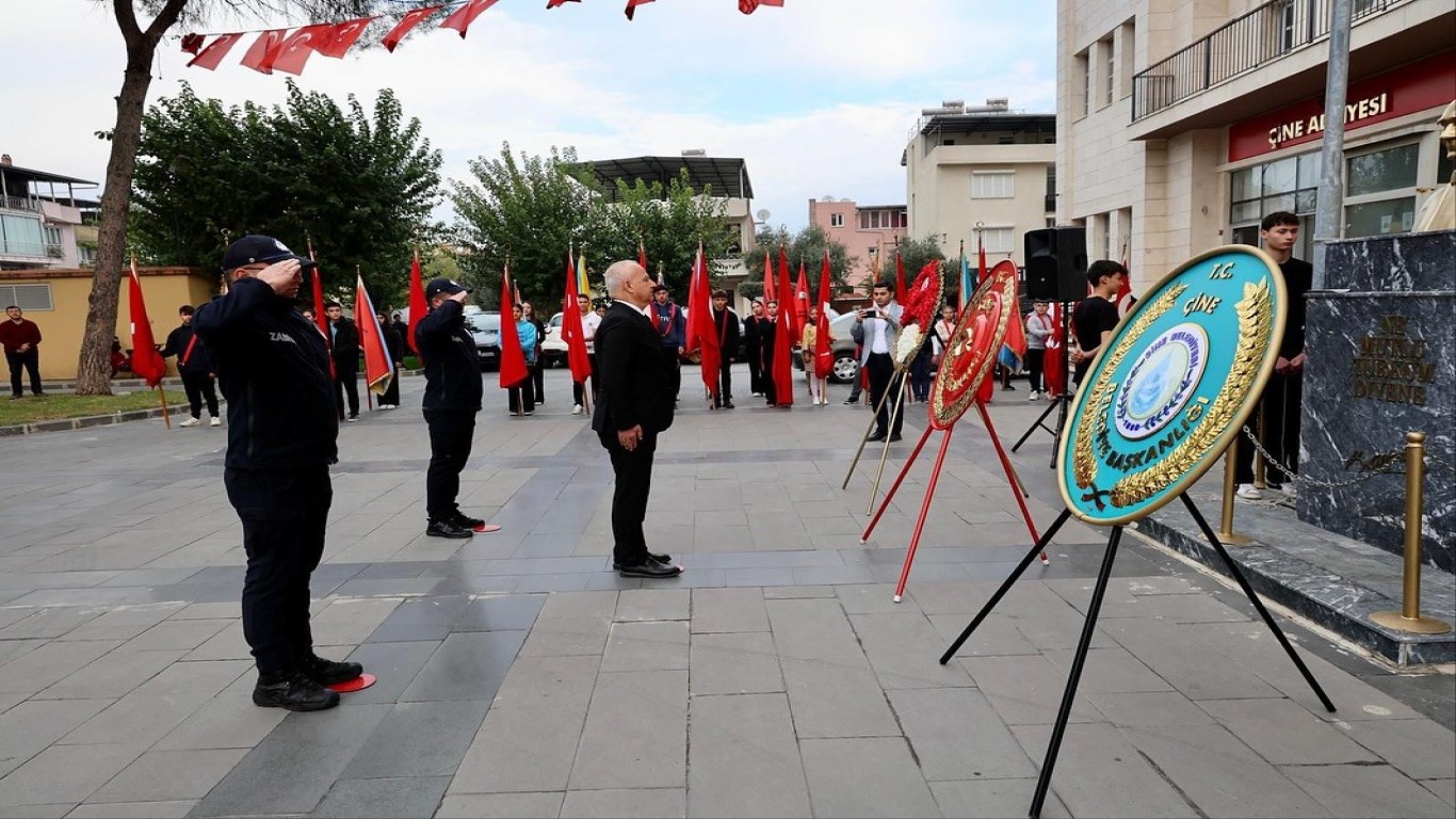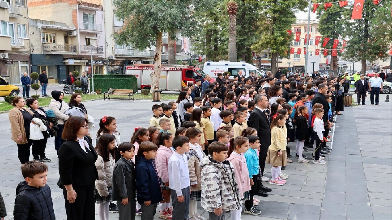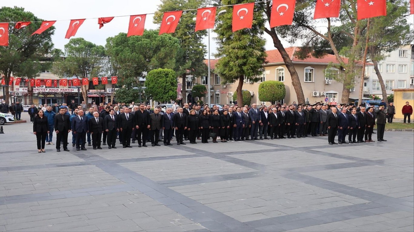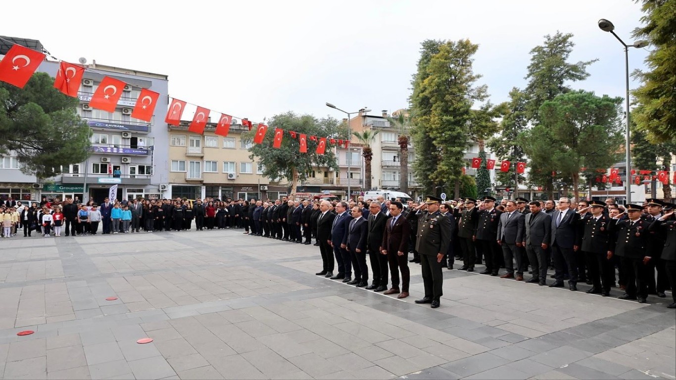 Çine Hükümet Meydanı’nda Atatürk Büstü’ne çelenk sunma töreni ile başlayan programda çelenk sunumunun ardından saat 09.05’te iki dakikalık saygı duruşunun ardından İstiklal Marşı okundu.