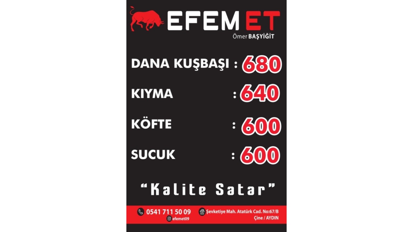 Çine'de hizmet veren ve sucuğunu markalaştırarak kalitesini kanıtlayan Efem Et kış sezonuna özel indirim uyguladı. Efem Et, taze et ürünlerini Çinelilere özel indirimle satışa sundu. Çine'de et piyasasını belirlemeye devam edeceğiz diyerek açıklama yapan Efem Et; Halkımız için en iyi büyükbaş hayvanları kendi besihanelerimizde yetiştiriyoruz. Kesimden işleme kadar tüm aşamaları kendimiz yapıyoruz. Böylece vatandaşlarımız hem daha kaliteli eti hem de daha uygun fiyata alabiliyor. Geleneksel hale getirdiğimiz indirimlerimizin bu yılki son kampanyası başladı. Tüm Çinelilerin faydalanmasını istiyoruz. İki besi çiftliğimiz ile 40 ton et kapasitemiz mevcut. Halkımızın yanında olmaya devam edeceğiz" dedi. (Yusuf Girgin)
