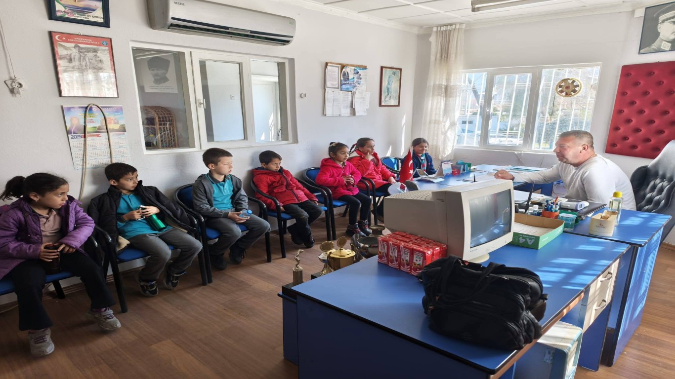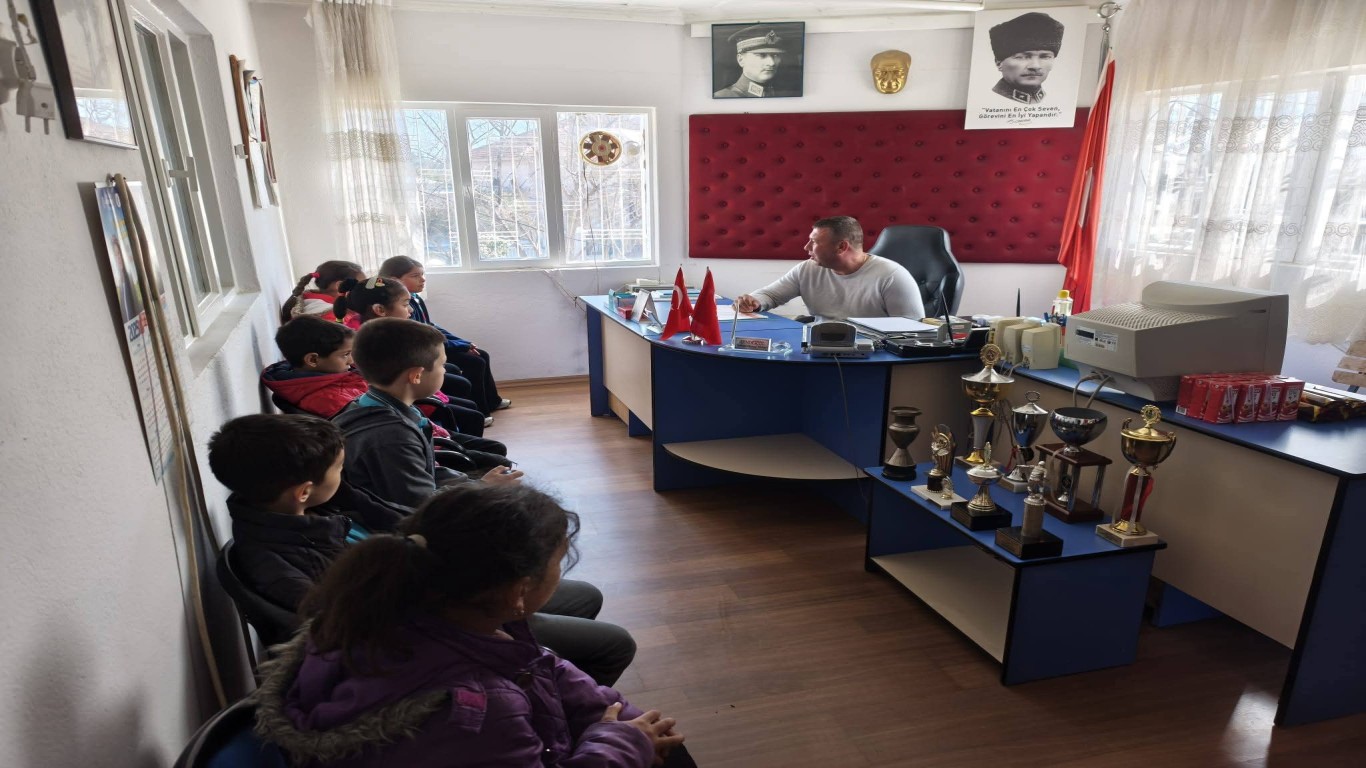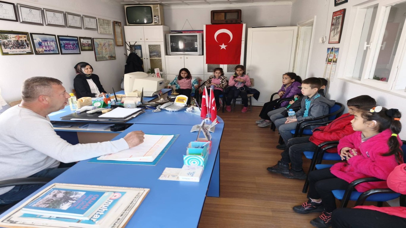 Çine Kahraman Mahallesi Muhtarı Taner İçöz, Kahraman Mahallesi İlkokulu 3. sınıf öğrencilerini makamında ağırlayarak onlara muhtarlık görevlerini ve mahalle kültürünü anlattı.